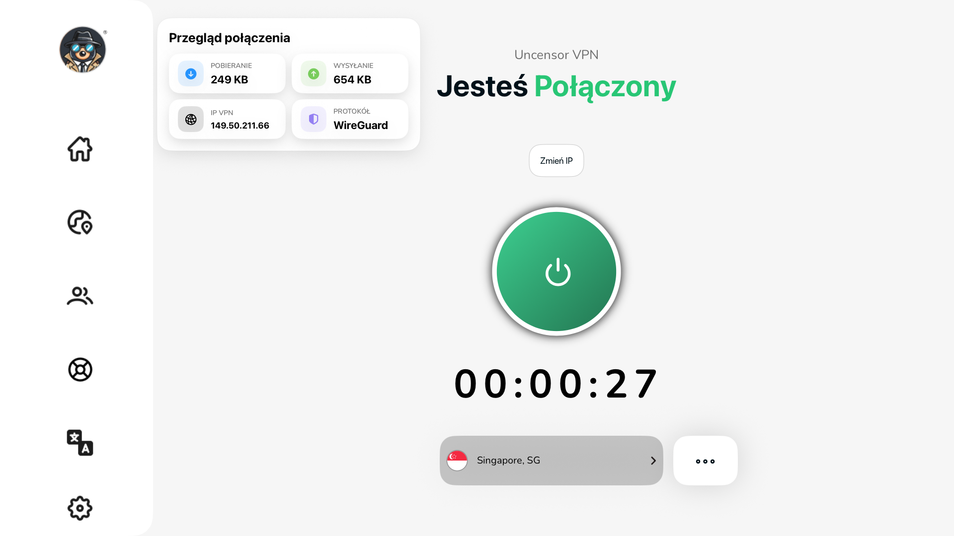 • Jesteś teraz połączony z aplikacją UncensorVPN z wybraną przez siebie lokalizacją.