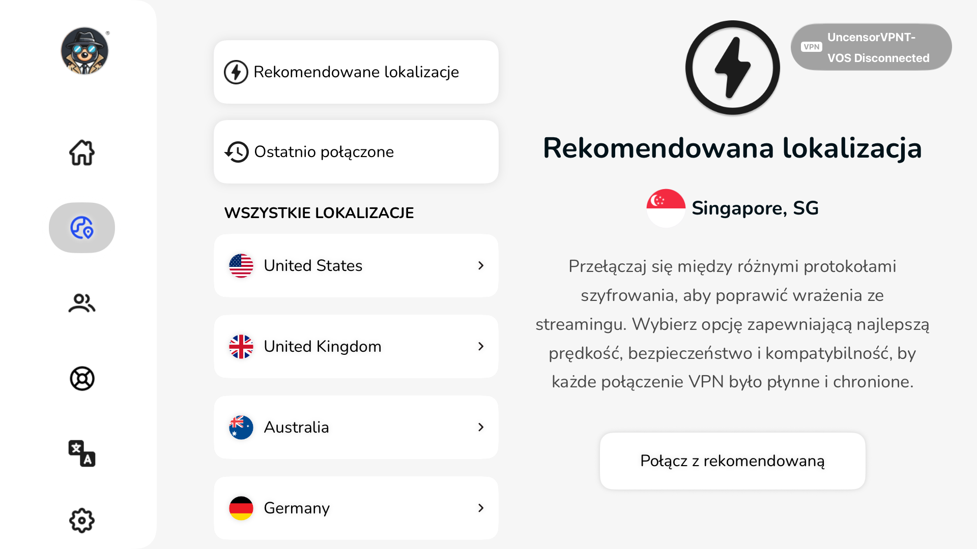 Rekomendowany serwer automatycznie łączy Cię z najlepszą lokalizacją sugerowaną przez nasz inteligentny algorytm, który wybiera serwer na podstawie Twojej odległości geograficznej. Dowiedz się więcej o tym, jak działa inteligentny algorytm UncensorVPN.