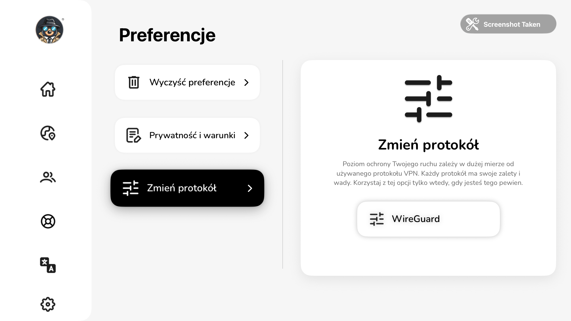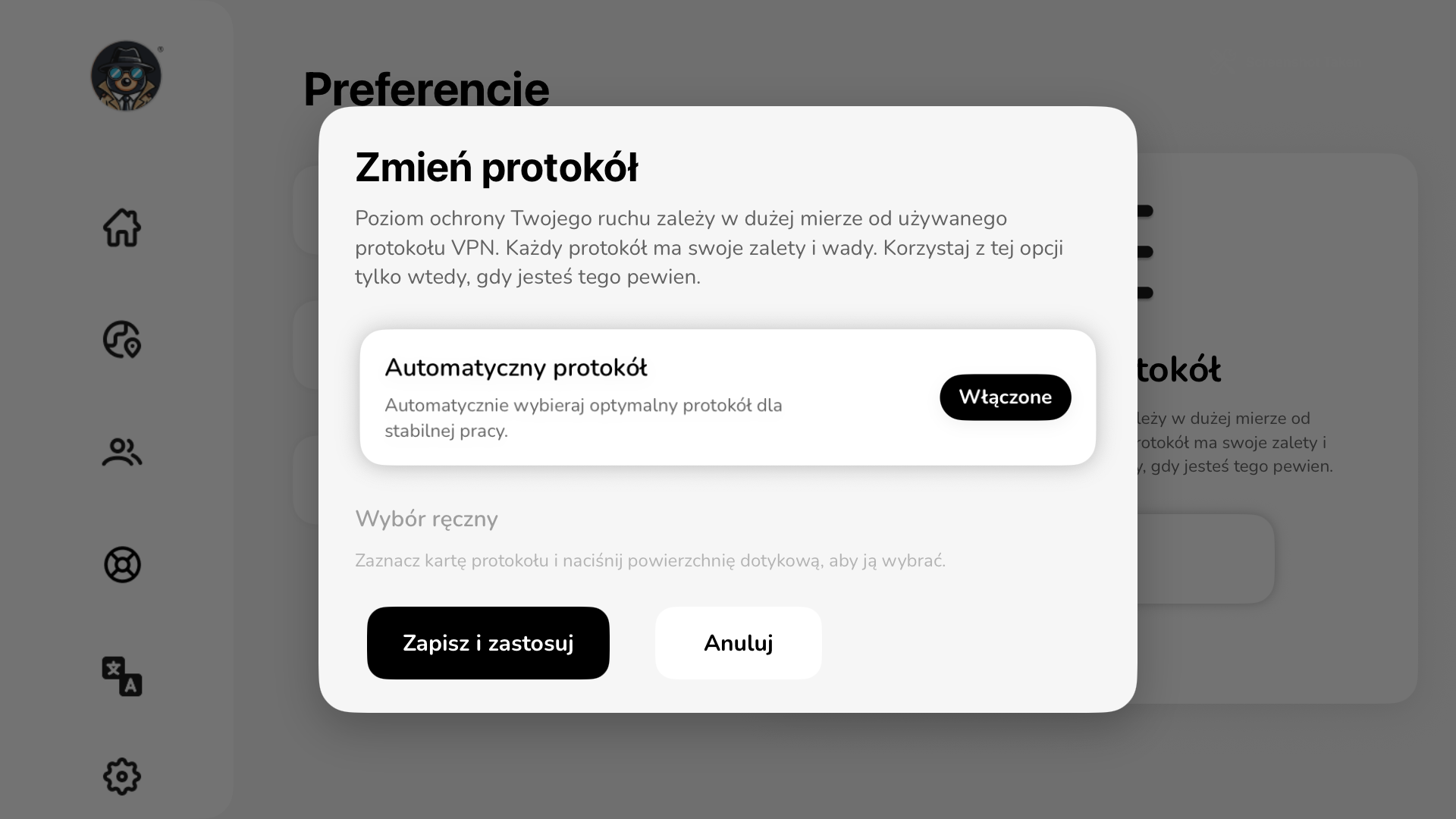 Uwaga: Aby ręcznie wybrać protokół VPN, najpierw rozłącz połączenie w aplikacji UncensorVPN. Następnie wyłącz opcję „Automatic Protocol”, aby wyświetlić i wybrać dostępne protokoły.